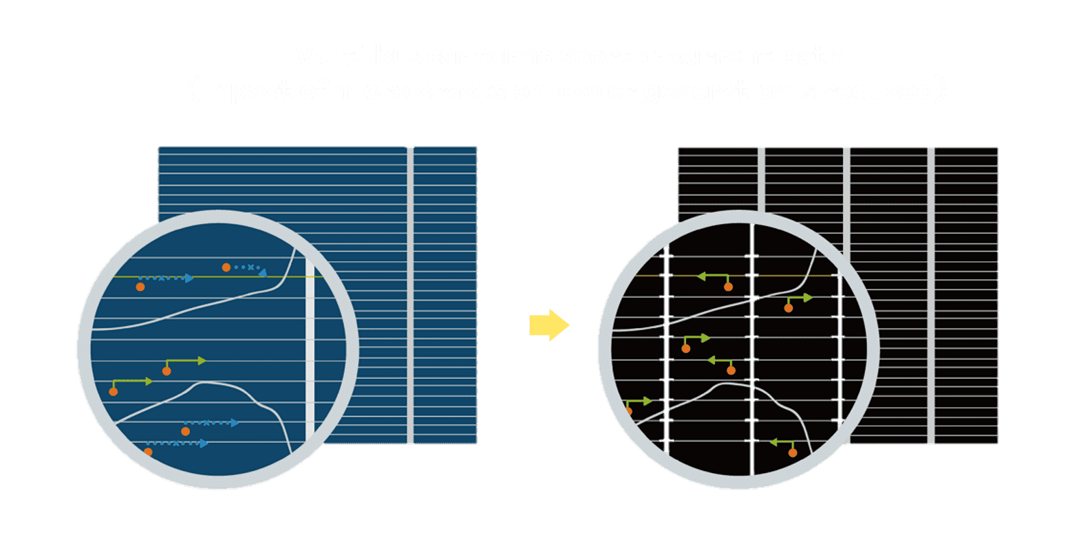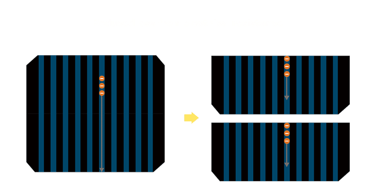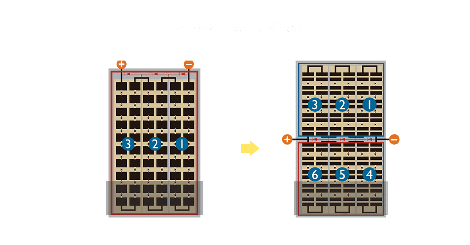- 结合半切电池,,,降低遮阴影响、、、提升模组抗隐裂能力、、并减少电阻损耗,,,,进一步提升模组发电效能。。
