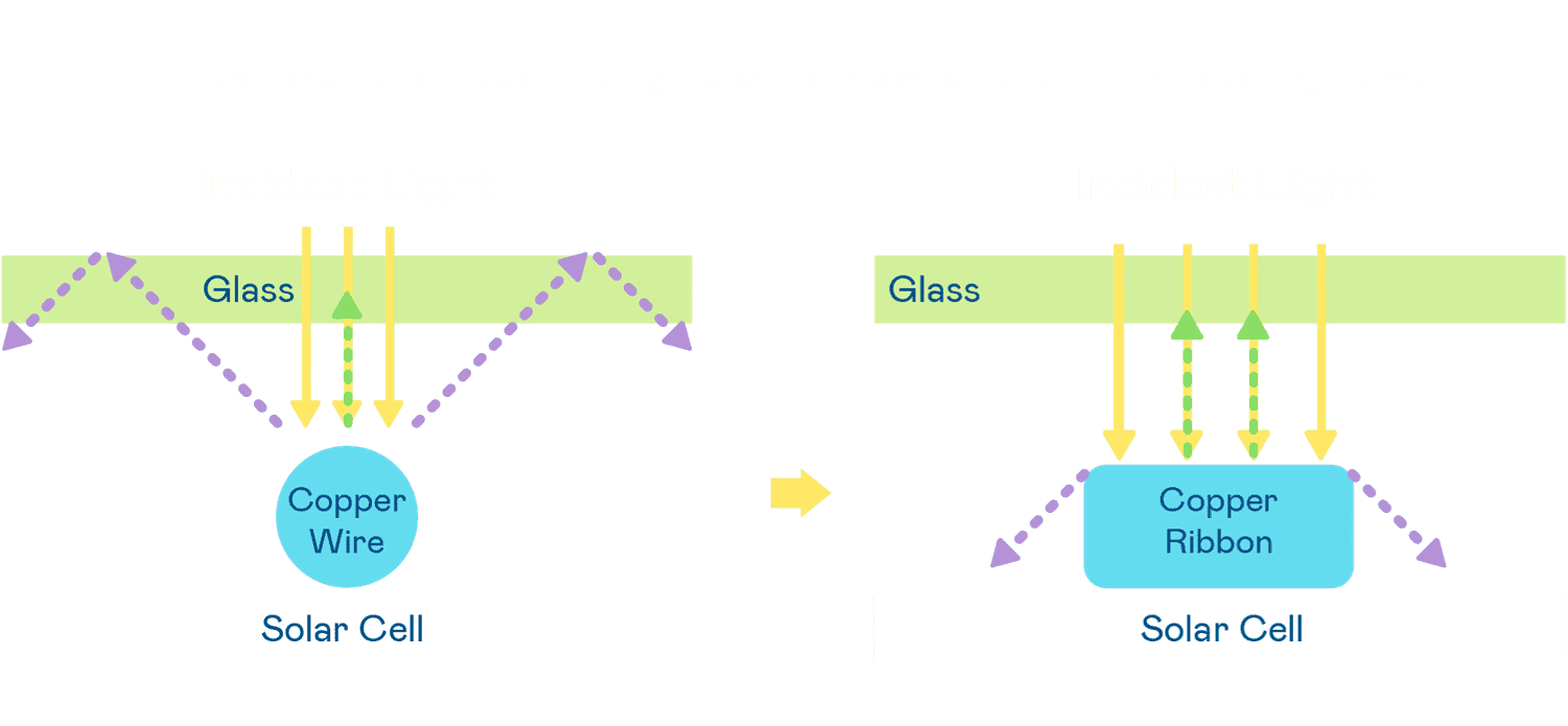 - 电池使用多条铜导线 (Copper wire) 于电池片上形成较短的电流路径,,,提高电流收集效率,,采用圆形设计的铜导线较传统扁平式的铜焊带 (Ribbon),,,,可增加入射至电池的光线量。。